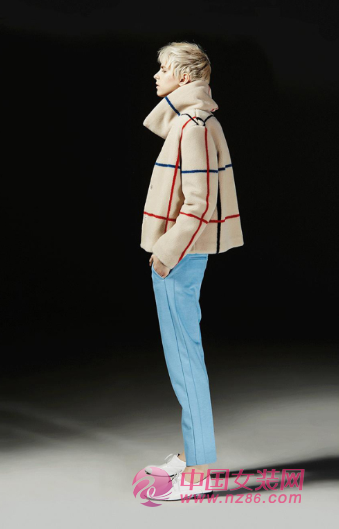 马海毛格纹大衣,面料经过拉毛处理,长毛呈现自然卷曲的效果,手感更加柔软蓬松。经典的大翻领A型廓形结合流畅的线条,将面料的特有风貌展现得淋漓尽致。淡淡的粉色充满少女气息,藏青色则带来一份干练与洒脱。内搭简约高领毛衣,体现闲适优雅的美感。