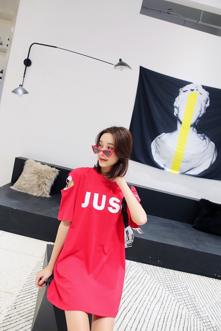 长款设计的左韩红色字母T恤十分修身显瘦,宽领剪裁可拉成比例,不仅显得脖子更加修长,还能视觉上把身材显得更高挑,配合灰色打底裤,随意休闲,是逛街出玩休闲的***选择。