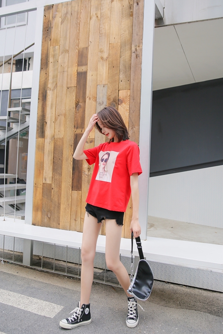 左韩的红色印花T恤配黑色短裤,应该是最常见的搭配了,不管是把T恤塞进裤子里,还是用中长款T恤遮住裤子,都是非常适合出街的搭配,同时也是秒变大长腿,看起来也没有黑色长裤那么沉闷最适合春夏了。