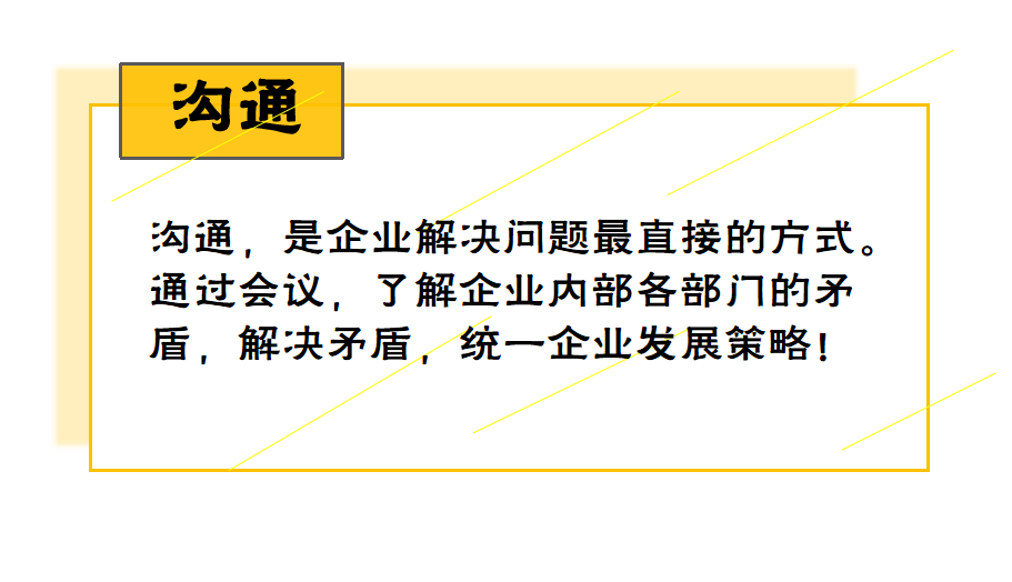 会议中阐述了,企业中发展的自身优势与不足,应提高企业核心竞争力,战略规划的正确认识与定位,“其兴也勃焉,其亡也忽焉”。健全管理制度,优化改进销售流程,落实组织内部的职务分工;提高产品的创新力和竞争力。