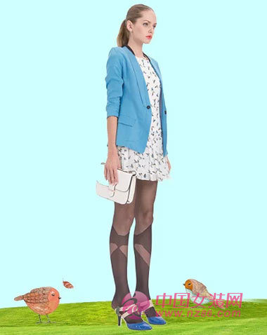 小鸟印花西装外套,充满趣味性,简约利落的剪裁,清新优雅,搭配压褶蓝色雪纺群,穿着时不经意间飘动,散发浪漫气息。