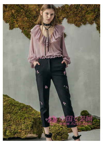 撞色系的搭配是日常穿着的***,灰紫色V领上衣+黑色休闲裤,整体休闲大方,时尚指数简直瞬间up。泡泡袖加木耳边的设计不仅十分减龄,还能遮掉讨厌的拜拜肉。