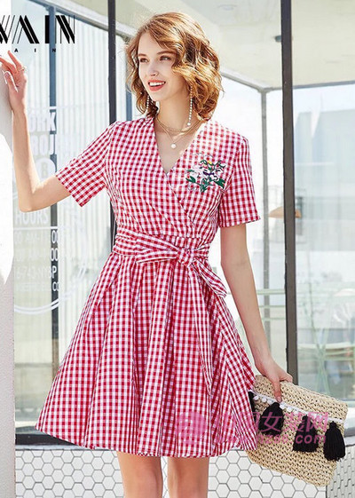 如果你喜欢经典一些的连衣裙的话,可以尝试一下格纹连衣裙。这条红色格纹连衣裙就是非常不错的选择,胸口用一朵绣花作为装饰,让裙子看起来甜美了不少。