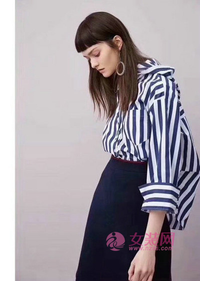 蓝白条纹衫,这种清新的格调可以居家时穿,不会造成拘束感。这种宽松的造型需要下身搭配深蓝色高腰的裙子,这样才会让上身服装不会因为宽松的造型造成臃肿。裙子采用了非常简洁的版型,搭配在一起色彩平淡却又透着简约和大气。