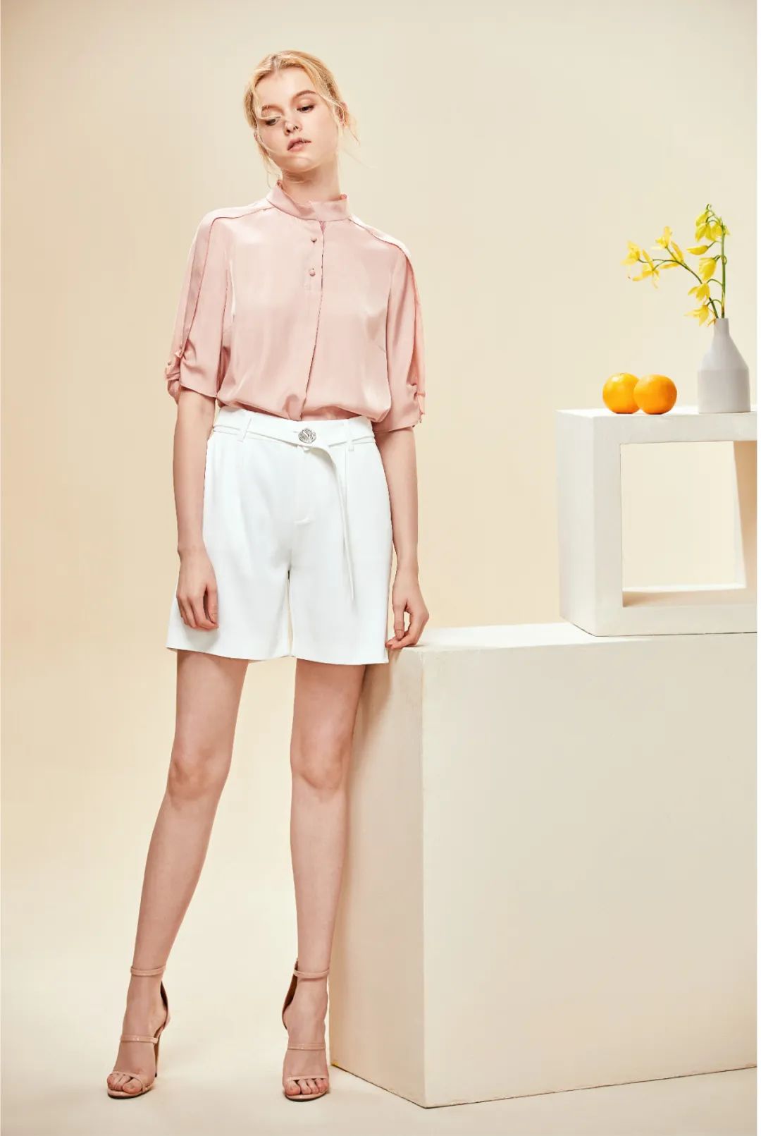 粉色上衣搭配白色短裤