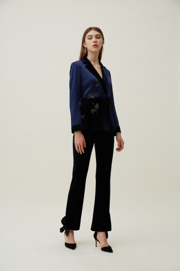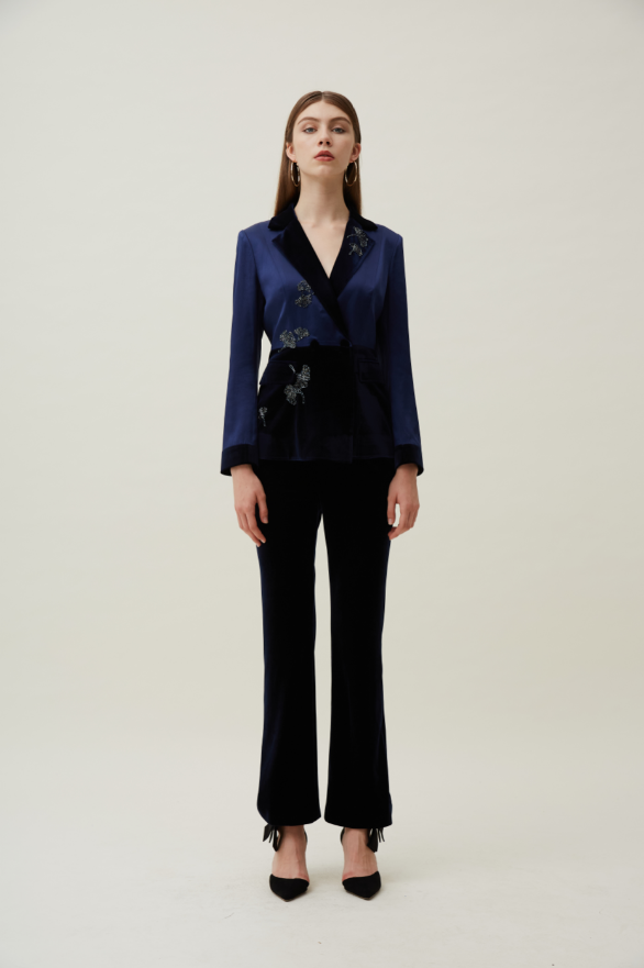 笔挺的西服套装版型融入垂顺质感的缎面光泽感面料,将女性的优雅气质焕然一新。拼色V领展露你姣好的脖颈曲线,简约大气;闪耀刺绣装点精致典雅,别具一格。