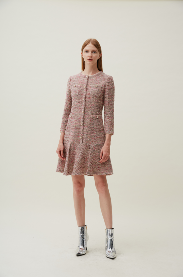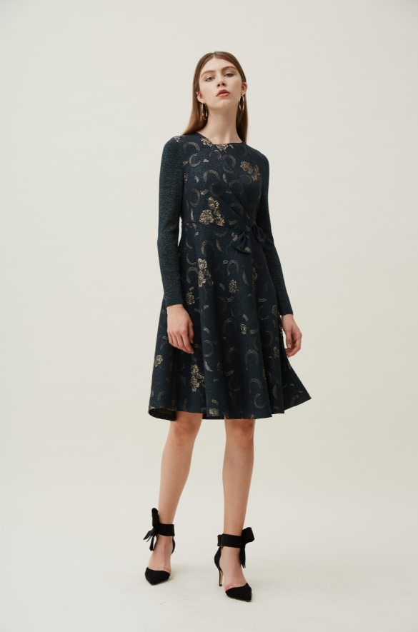立体挺阔同时兼具面料自有的舒适感,上身立显气场。裙身在金丝线的勾勒下极具高级感,秋风起,裙摆扬起,留下一路悠长。