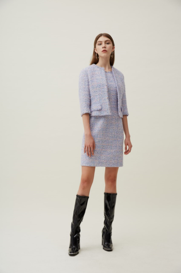精致的绣片在阳光的反射下散发着不一样的异彩,合体剪裁贴合女性柔美的曲线,让自信由内而生,让优雅自然流露。