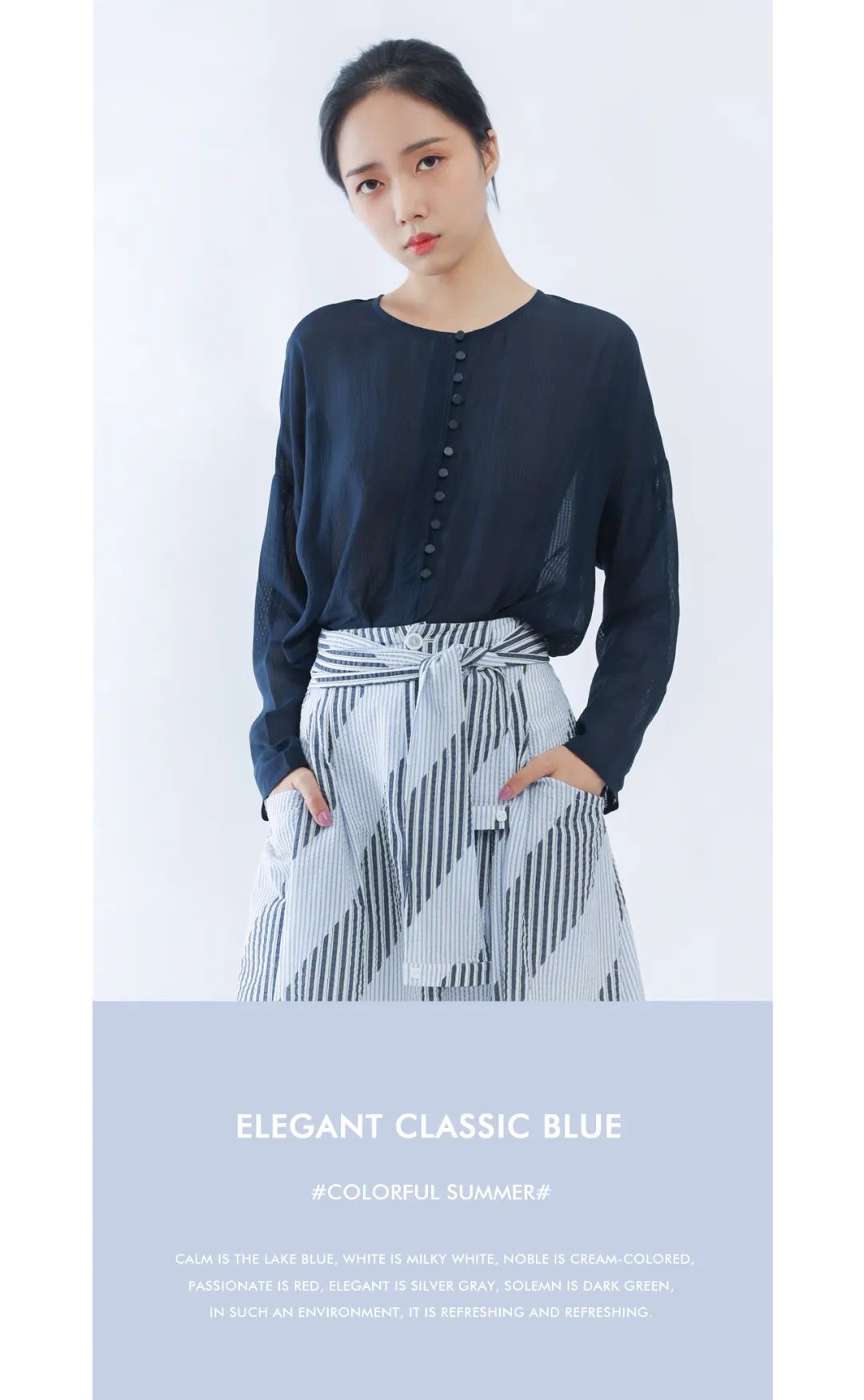 简约色系铺展清新质感,游走于烂漫与灵动之间,简雅经典的蓝色系,传递简约穿搭美学,举手投足之间释放精致格调。