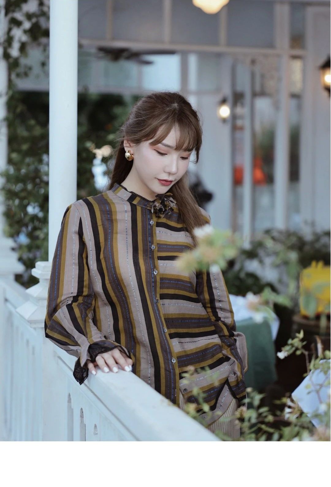 LOOKA:经典时代三件套被设计为一件式连衣裙,复古撞色条纹、荷叶边蕾丝V领、花苞喇叭袖、古典束腰...浪漫女性元素集于一身, 仿若油画中的曼妙女郎。