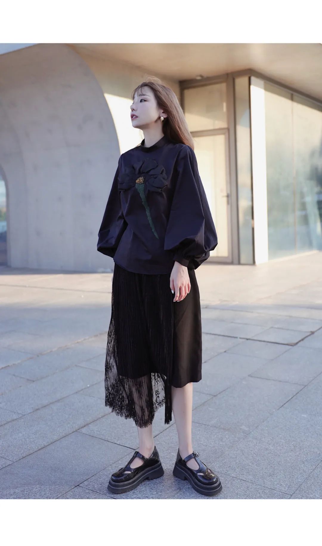 LOOK A:少糖暗黑系少女绝不盲从奶油糖果色,欧式宫廷感喇叭袖上衣在前襟可见欧根纱手工立体花朵,下搭同色蕾丝裙低调而高级。