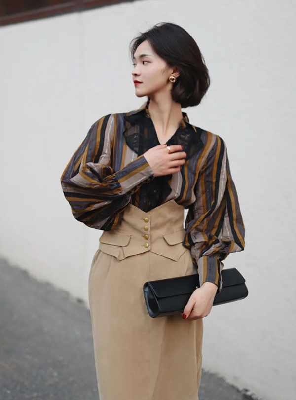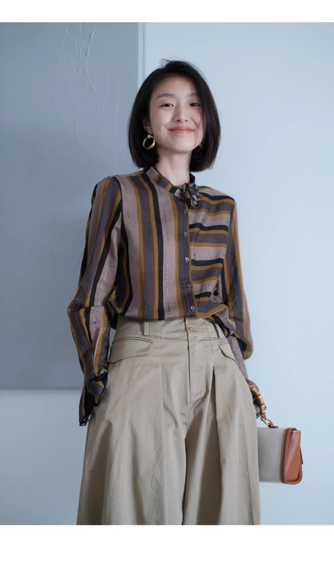 LOOK A:高级色系的层次叠加简约而不失时尚度,衬衣经过条纹的不同方向拼接时髦显瘦,搭配大廓形阔腿裤,舒适而大气。
