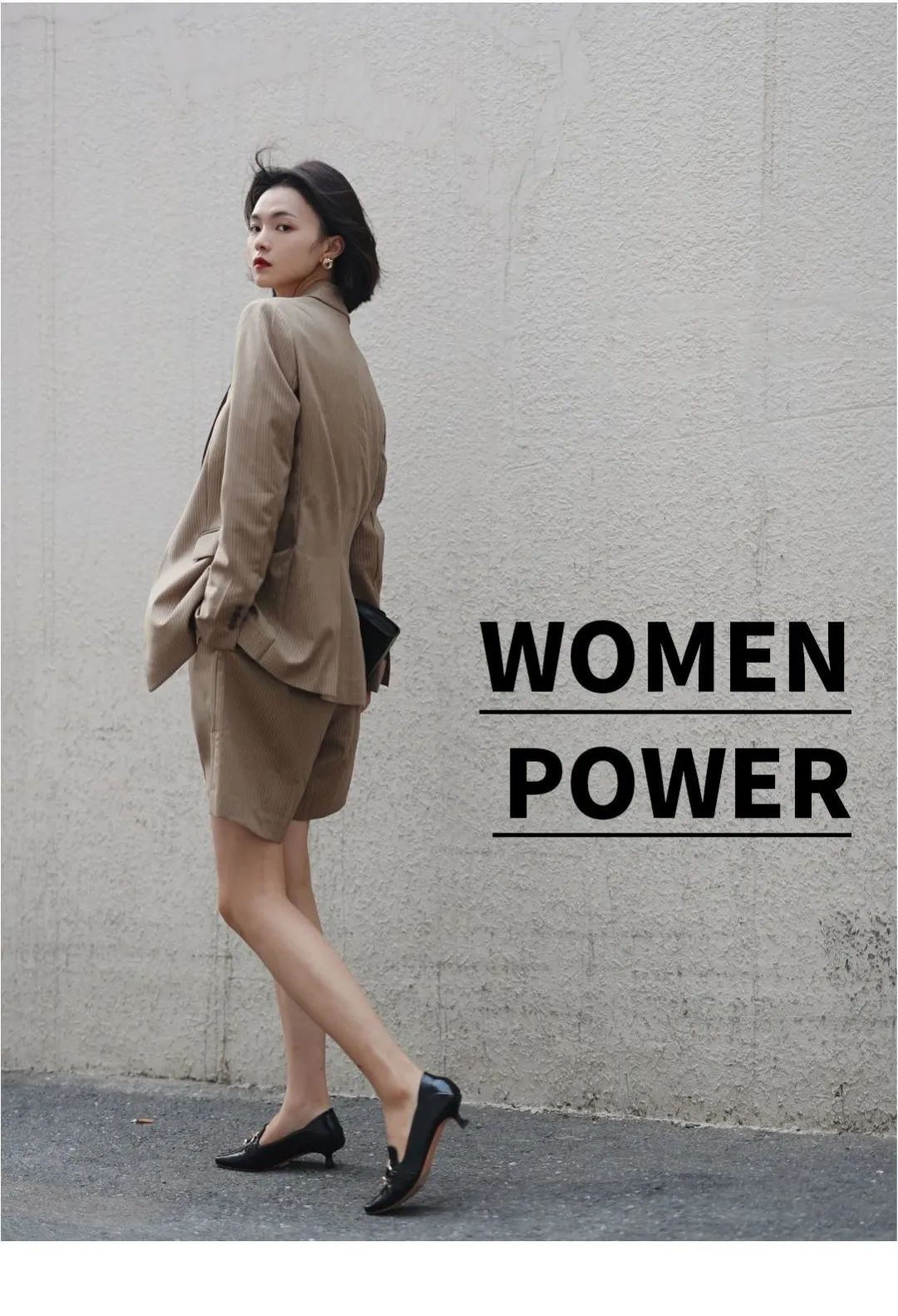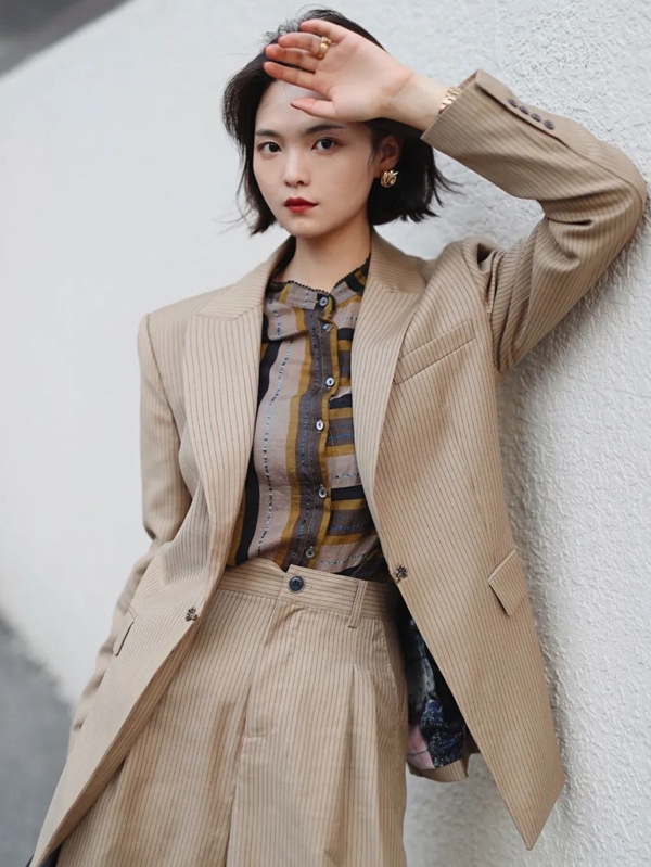 LOOKB:以甄选***羊毛为原料的精纺面料西装,剪裁干练,50年代式曲线与现代摩登结合,复古而新潮,搭配同色系条纹衬衫及短裤,高级感中彰显WomenPower.