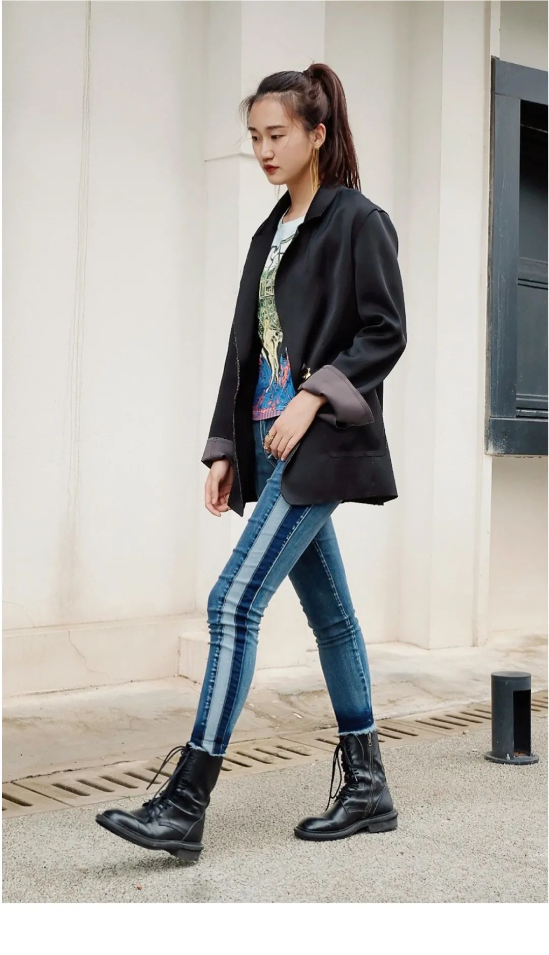 LOOK B:当代酷飒女性回归,宽松缎面西装结合率性毛边工艺,低调的高级感与被打破的严肃,搭配休闲风T恤及牛仔裤,都市感迎面袭来。