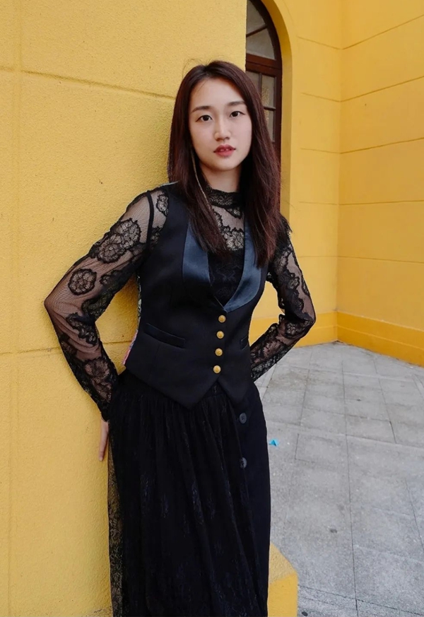 LOOK A:蕾丝与花朵抒写女性唯美浪漫气息,从上到下的蕾丝面料注入柔情之时,-一件修身小马甲带来挺括与修饰,搭配出令人流连的风景。
