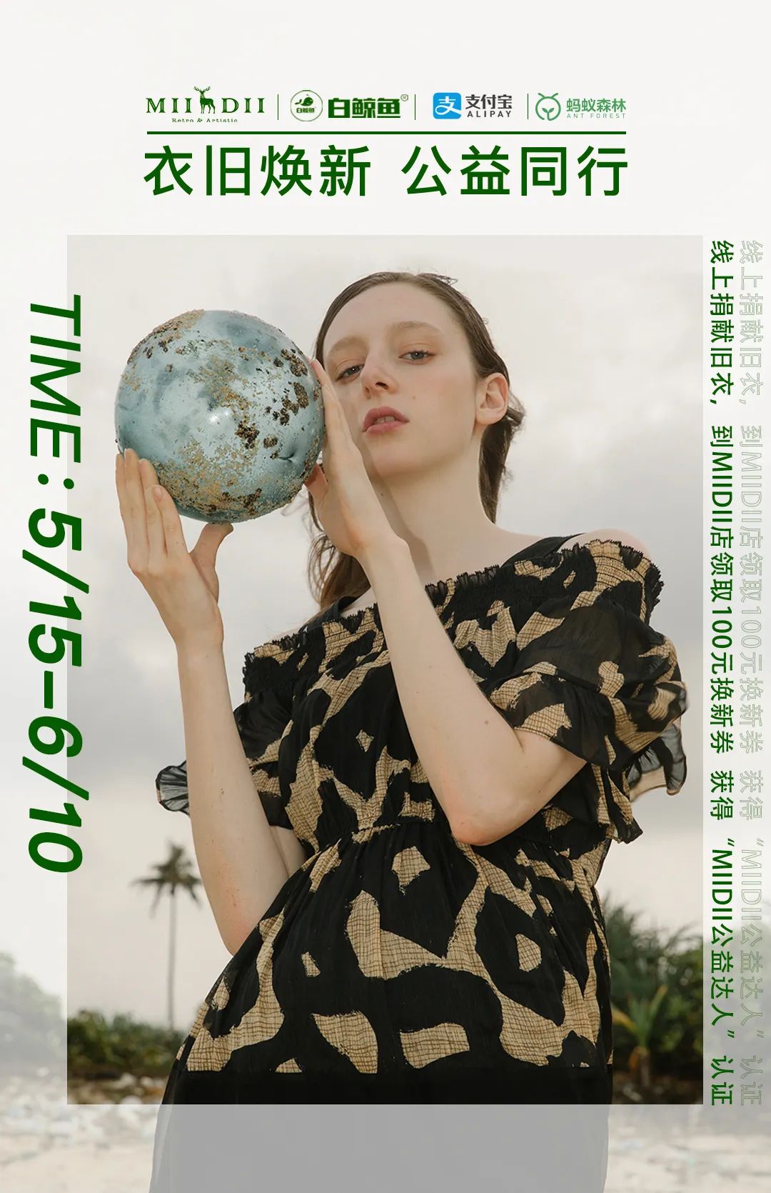 在世界环境日来临之际,MIIDII谜底联合白鲸鱼环保公益平台发起倡导,“衣旧焕新,公益同行”,将不再穿着的旧衣服捐赠出来,送至MIIDII谜底指定门店,这些旧衣将会用于公益捐赠或环保再生加工,捐赠者也将得到专属购衣优惠,和定制荣誉证书,为环保助力的同时,也能享受可持续时尚行为的福利。