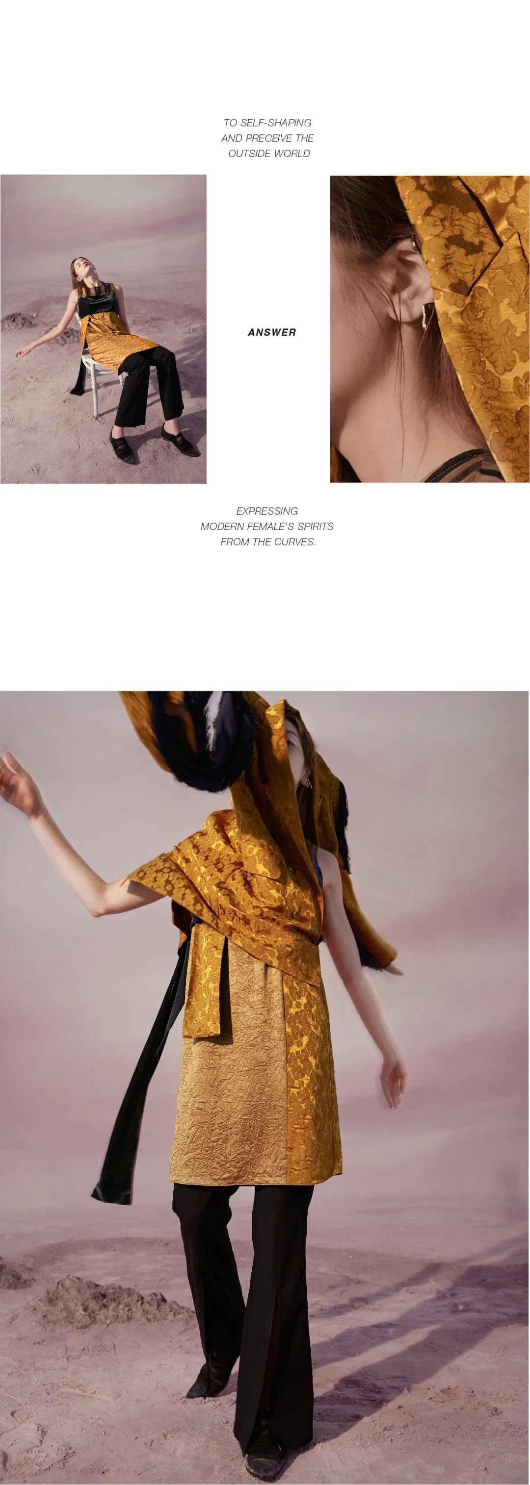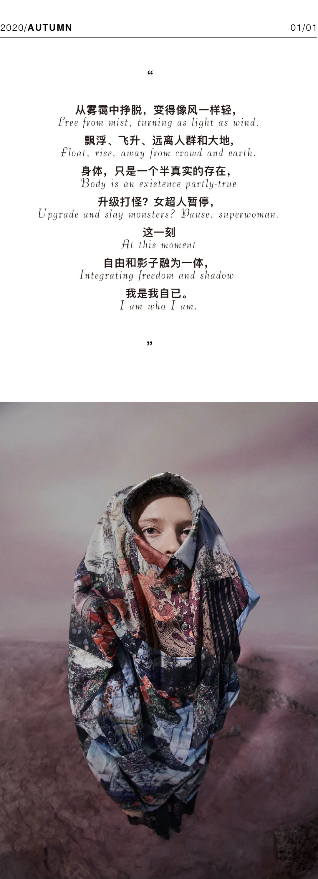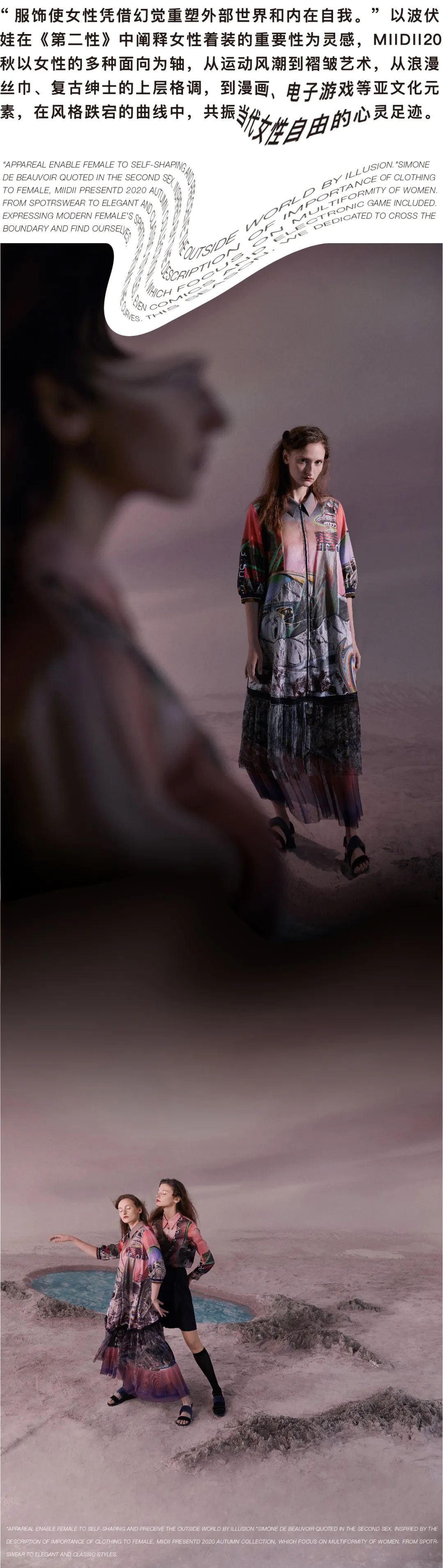 MIIDII谜底2020 AUTUMN是向外探索,向内探询的一季。无论是与外界的关系,或是对自己的认知,纵使清醒异常,我们仍无法得到真实的回应。我们如此用力地生活,能得到一半真实就足够了,甚至相较于真实,一半 虚幻、一半真实,一半回忆、一半未知,才显得自由和有趣。