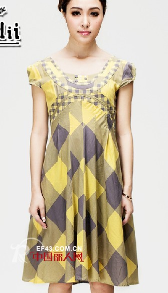 这款颇具田园风格的连衣裙也是格子元素。大块的紫色和黄色方块斜纹相互交错,空间感十足。大圆领用小方块拼接与下身裙形成对比,在胸部创意地与圆领对称拼接很好地修饰胸部曲线。修身的裁剪自然而然地将裙摆形成褶皱,非常飘逸。清新可人的感觉就是这么自如的散发。