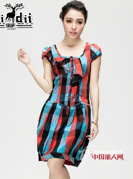 衬衫制式的花苞裙,通身的红蓝格子是不是有让你眼前一亮。在细节之处也可圈可点。圆形领口不规则荷叶卷边修饰,公主风的泡泡袖,腰胸部束腰式的裁剪还有点欧式复古的味道呢,如此的元素都集合在一起。给人很别致的感觉。