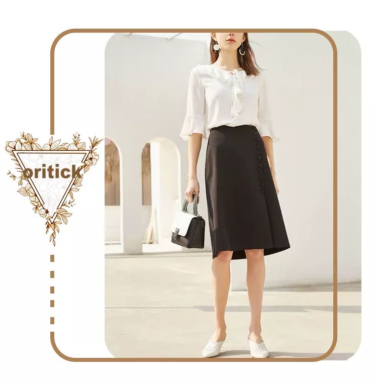 而收腰设计勾勒出灵动身姿,下搭的黑色半裙,