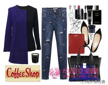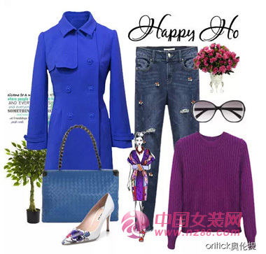 修身立体,剪裁大气的蓝色毛呢大衣,时尚优雅大气,跟镶嵌精致珠片的破洞牛仔裤碰撞出不一样的英伦范,再搭配简洁百搭的纯色系毛衣,潮味十足。