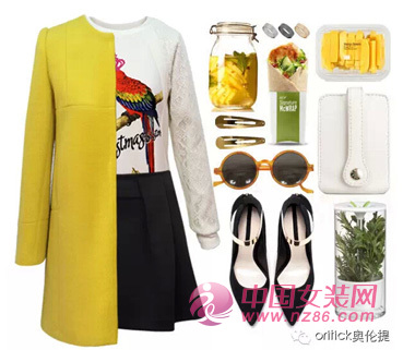 黄色的H型毛呢大衣,颜色明亮耀眼,宛如冬季里的太阳。简单搭配网格的衬衣,一条简约的小黑裙。休闲时尚,又不失俏皮可爱的风格。