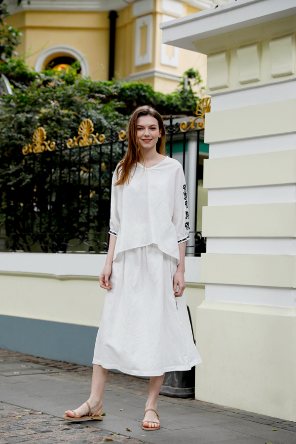 这款休闲套装穿搭是不是看起来很是文艺,白色的休闲套装在夏日也很是非常显气质哦,在夏季选择这样的搭配很是清爽,采用优质的透气棉麻面料制作而成,上身舒适简约,清爽舒适,下身采用白色半裙的穿搭手法很是好看,短袖的设计采用时尚字母印花的点缀,搭配一双凉鞋,整体的造型随性又很慵懒。