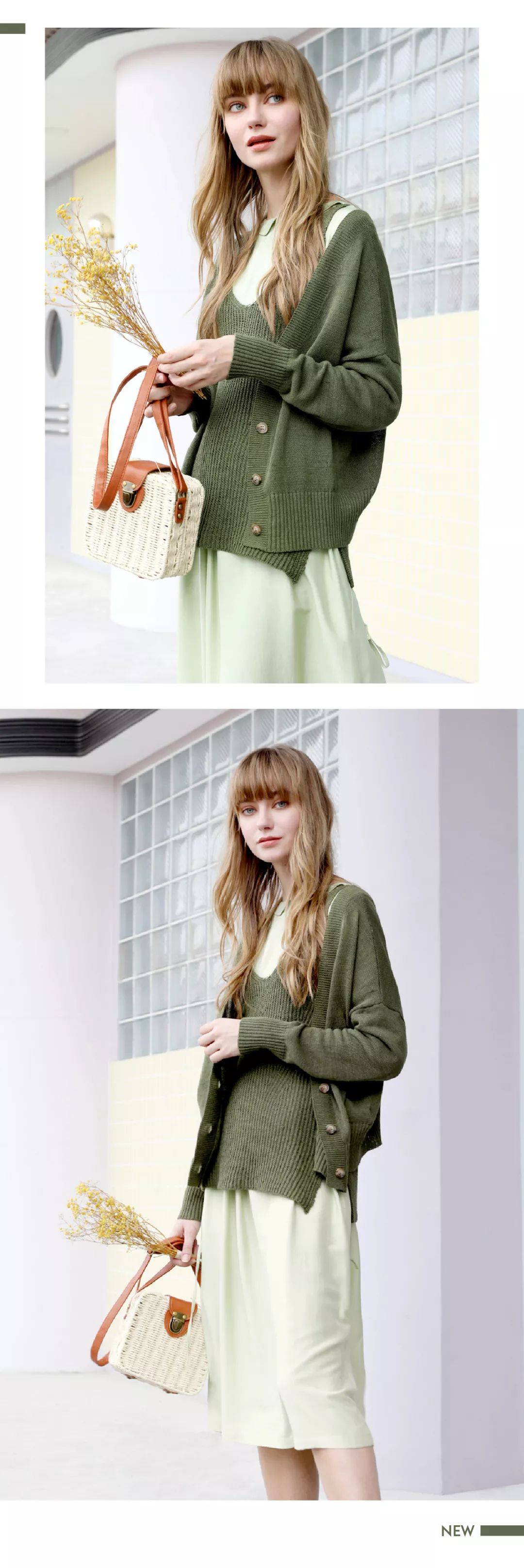 针织开衫套装与浅豆绿连衣裙打开复古气质