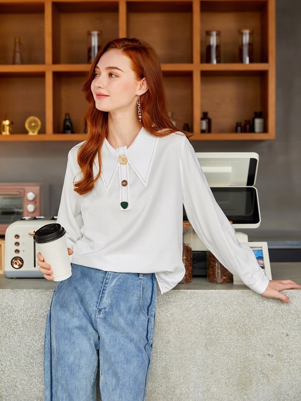 5、对于夏日来说,牛仔裤当然也是必不可少的啦,配上这件白色上衣,有着特色的衣领设计,充满活力气息的撞色系色纽扣,不需要太多的装饰,穿上一双小白鞋,看起来十分的清爽,干净大方,出门游玩或和朋友一起逛街都是不错的选择。