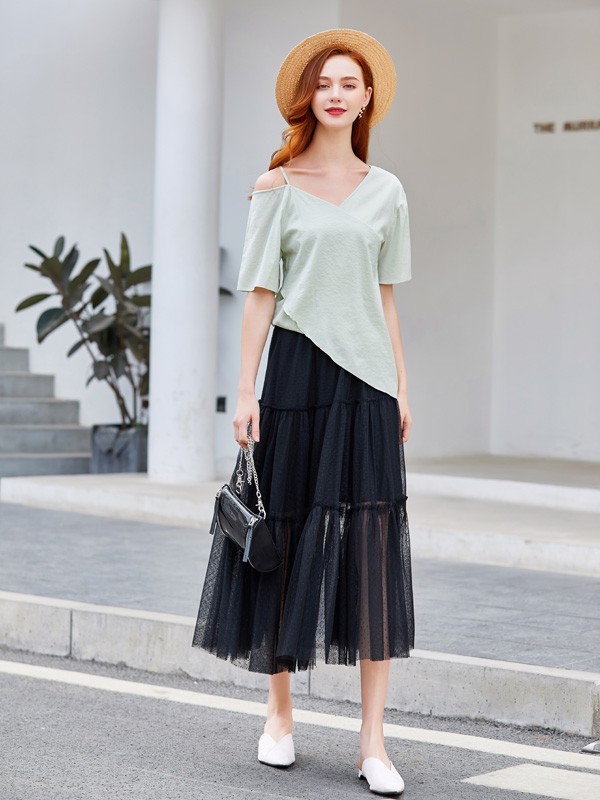 4、这款马卡龙色上衣,简约随性的版型设计慵懒味十足,而衣领上的小心机设计可谓是点睛之笔,与纱裙的完美结合,可以让你舒适的同时又不失时尚,跟闺蜜喝个下午茶什么的就很合适呀。