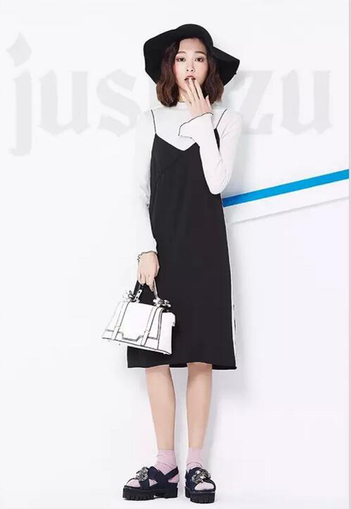 简洁明快的微型领上衣,采用韩风依旧的水袖设计,袖口和领口的黑色精致木耳包边,清新优雅;搭配今年风靡的睡衣式吊带长连衣裙,质地柔软有光泽,春风里飘逸自然清新;提上黑白配色的包包和单鞋,让您一秒到韩国。