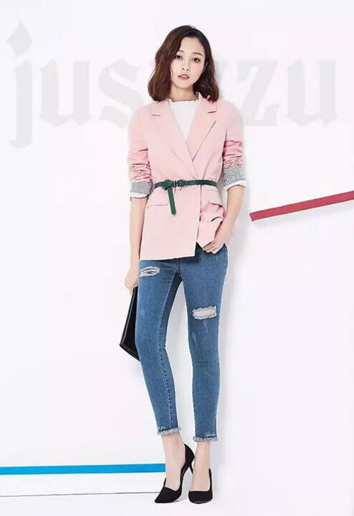 甜美知性的简约大领西装通过丛林绿腰带点缀和束腰,体现春天里的清新自然;内穿撞色包边波浪微领上衣,下搭修身弹力磨毛边的破洞牛仔裤,整套穿着清新明快,在知性甜美中透出流行都市女人味。