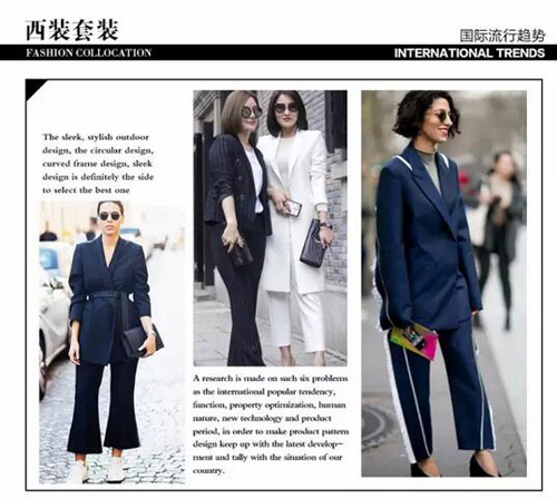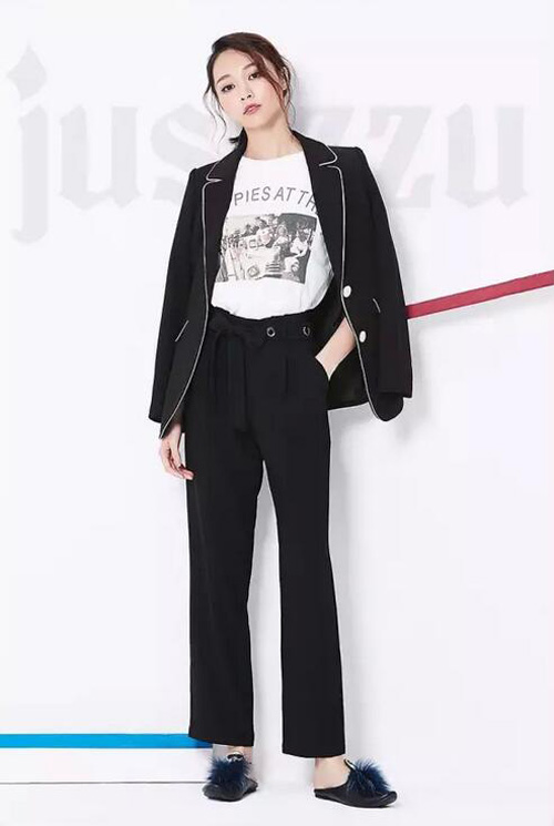 黑色经典西装采用白色精致包边,轮廓清晰明了;混纺面料质地舒适,高贵大方不失时尚感,蝴蝶羽翼的西装领设计新颖柔美;青春洋溢的图片T恤搭配直筒西装裤,让职业丽人更添一分都市休闲气息。