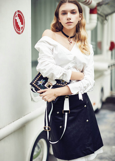 炎热的夏季就是要穿的清凉,露肩长款白衬衫搭配黑色小短裙再合适不过了,把白衬衫扎进小黑裙里长短不一个性十足,露出锁骨,则更加性感时尚。既能秀出大长腿又十分显高。
