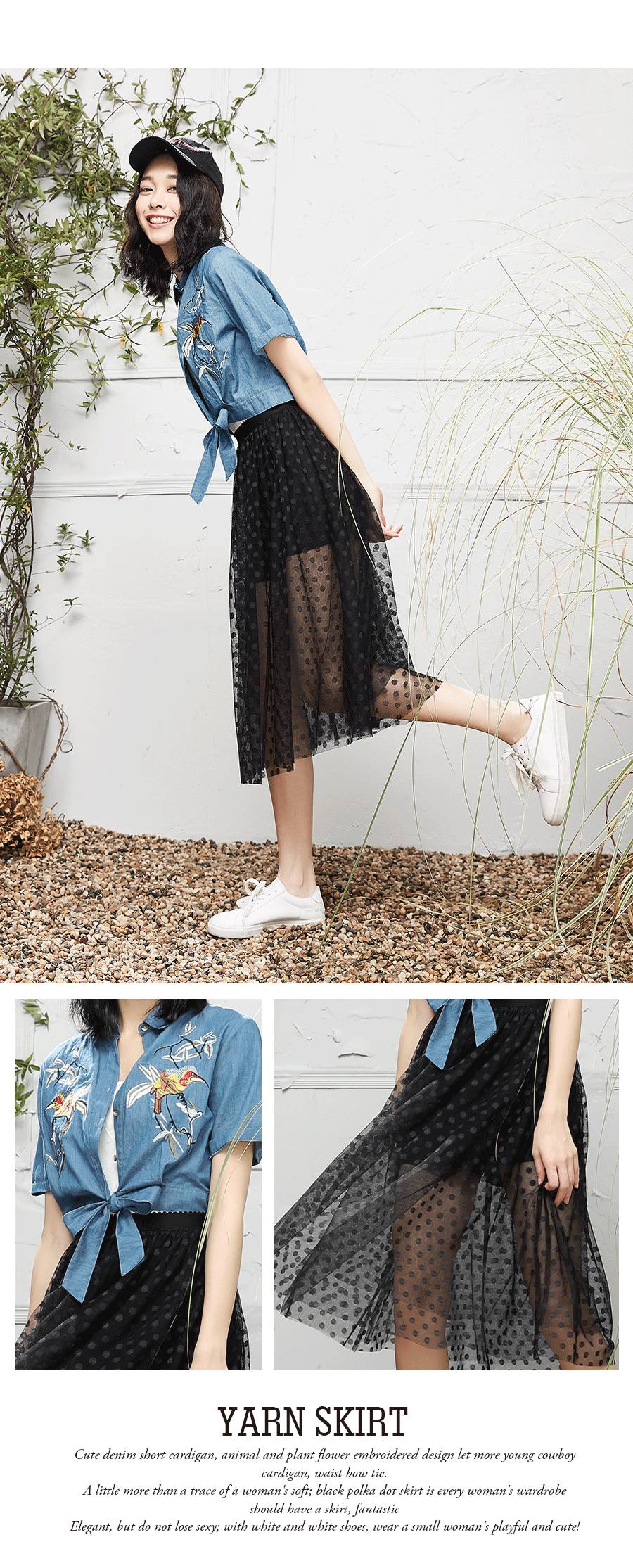 ▲▲俏皮可爱的牛仔短款开衫,动植物花卉绣花设计让牛仔开衫更加青春有活力,腰间蝴蝶结系结的方式更多了一丝专属于女性的柔美;黑色圆点纱裙是每个女人衣橱中都该有的一款裙子,梦幻优雅,却不失性感;搭配白色内搭和小白鞋,穿出小女人的俏皮与可爱!