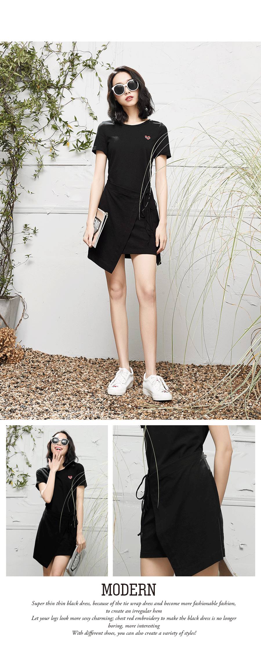 ▲▲超级显瘦的黑色简约连衣裙,因裹裙的系带穿法而变得更加的时尚摩登,打造出来的不规则下摆,让你的双腿看起来更加的性感迷人;胸口的红心刺绣让黑色连衣裙变得不再沉闷,更加有看点;搭配不同的鞋子,也可以打造百变的风格!