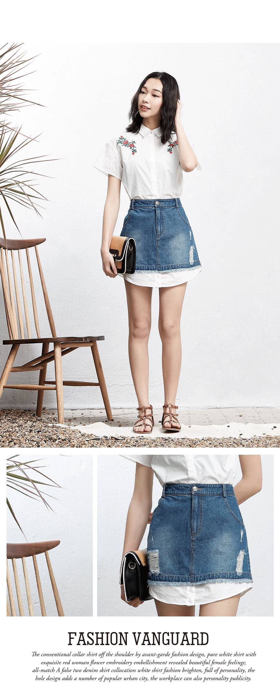 ▲▲常规领衬衫采用落肩设计时尚前卫,纯净的白色衬衫用精致红色女人花刺绣点缀透露柔美的女性情怀;百搭的A型假两件牛仔短裙搭配白色衬衫时尚前卫让人眼前一亮、个性十足,破洞设计增添了一些都市流行,都市职场也可以个性张扬。