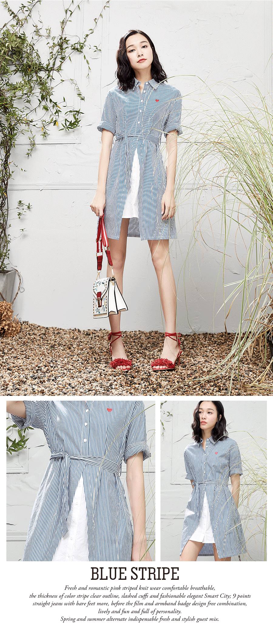 ▲▲海军蓝竖条纹衬衫连衣裙,不仅可以穿出属于夏天的清爽,更能分分钟让你看起来更瘦更美;袖长的长度可以遮盖掉你不想露出的部分,刚刚好露出纤细的手臂;前片采用开叉拼接的设计,让你穿出时髦感!