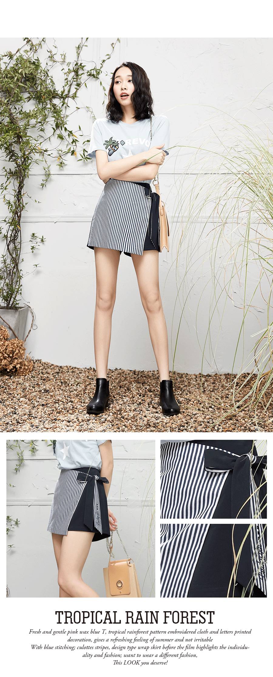 ▲▲清新温柔的粉腊蓝色T,热带雨林图案贴布绣和字母印花装饰,给人一种夏天的清爽感而不烦躁;条纹与藏蓝色拼接的裙裤,前片的裹裙式设计更凸显了个性与时尚;想要穿出不一样的时尚,这套LOOK你值得拥有!