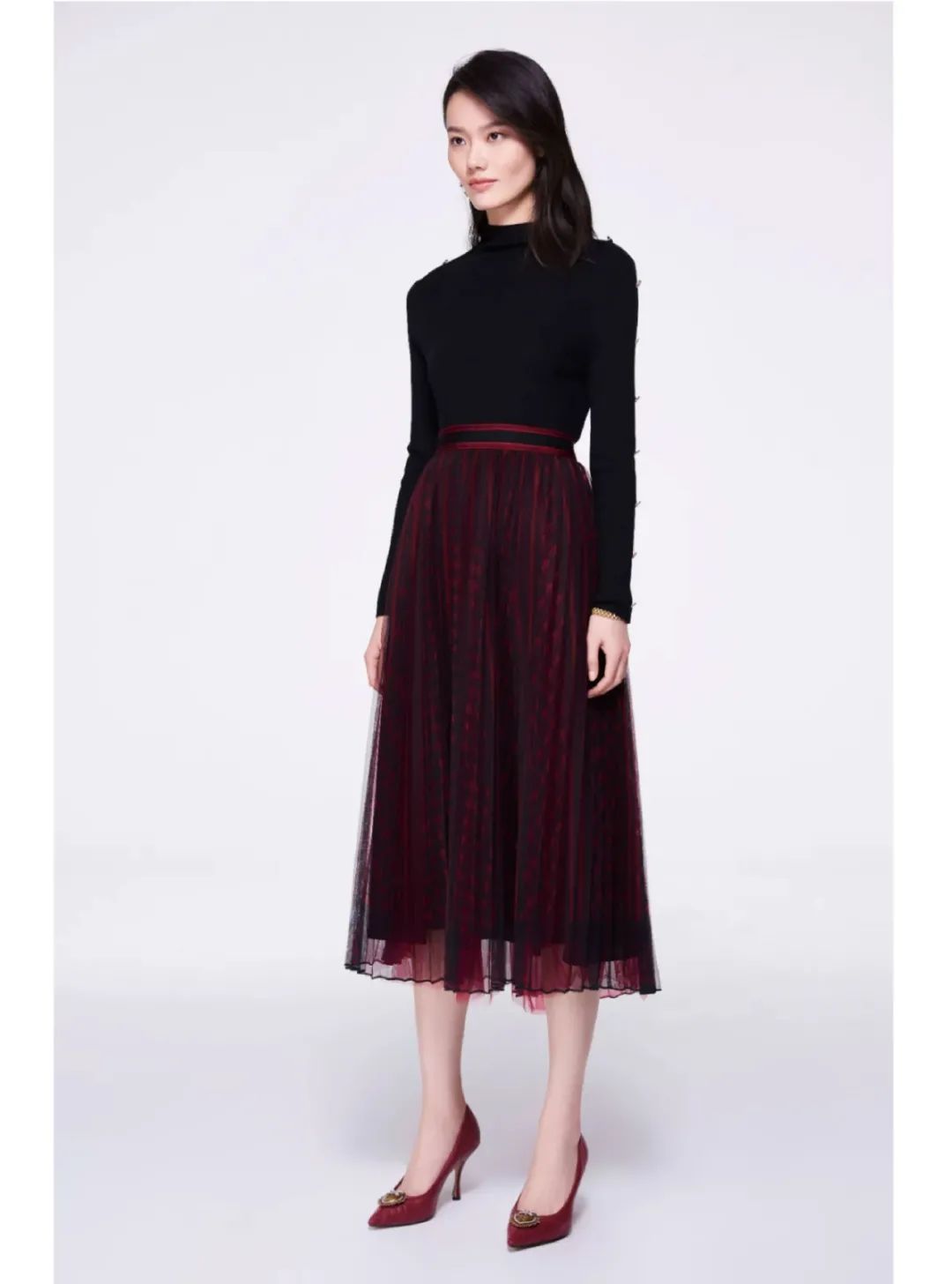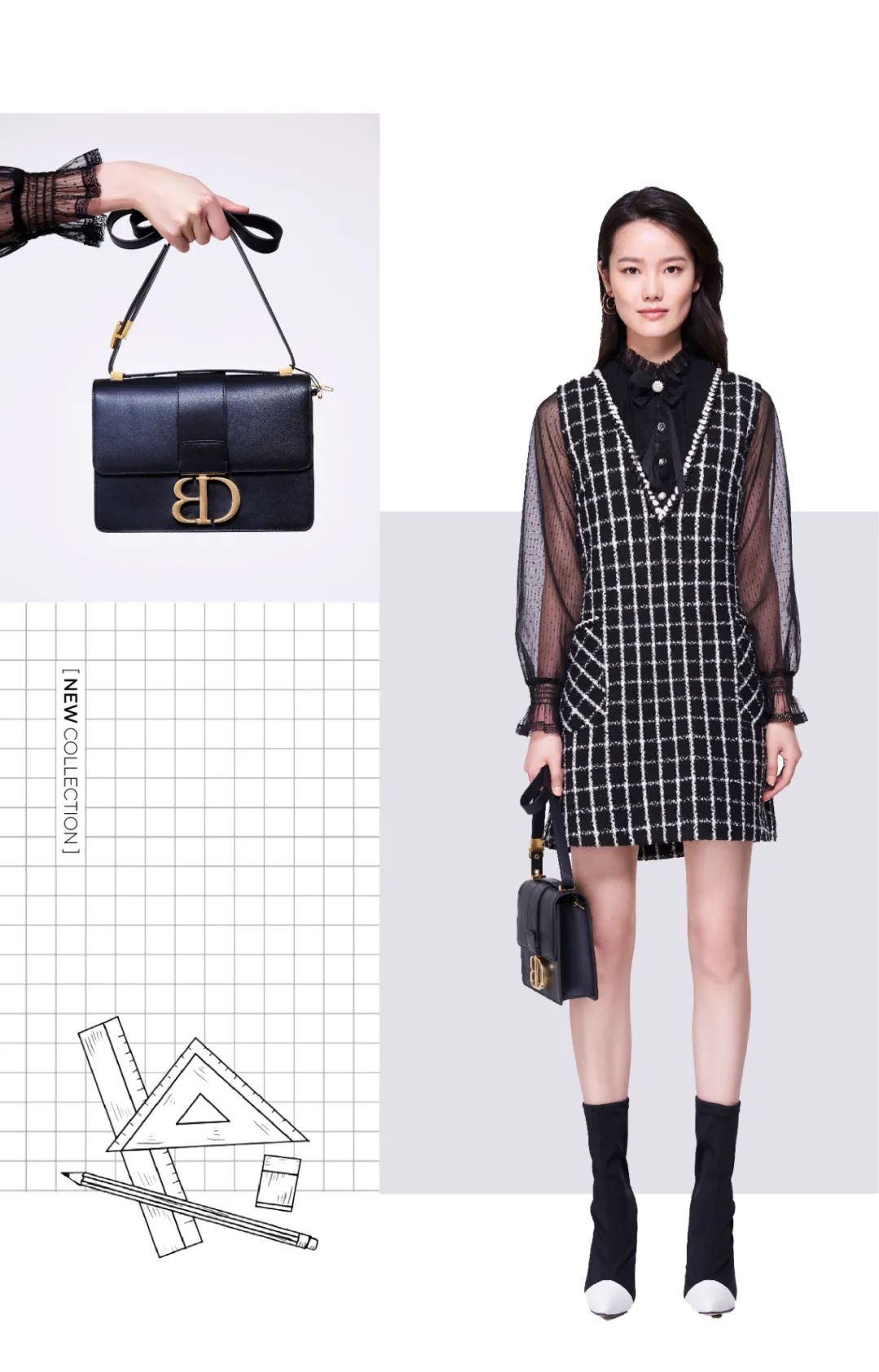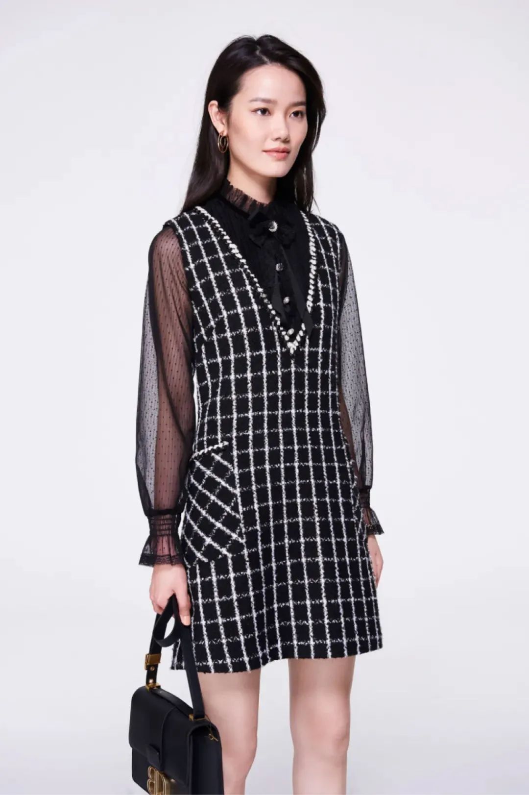 经典黑白格纹粗花呢+通透网纱面料带来朦胧感