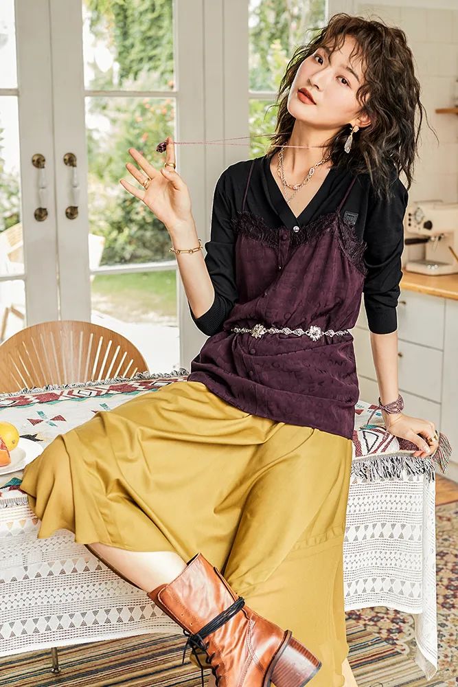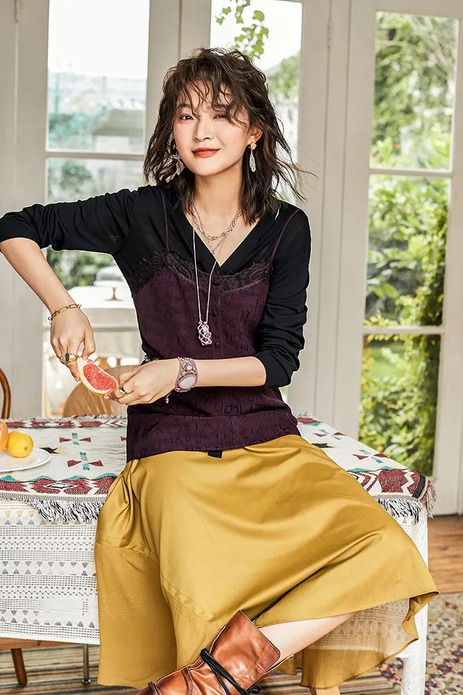 缎面裙轻柔光滑的材质可以让整体 look 看起来更加轻盈柔,上身既精致又能彰显品位~也可以利用顺色原则,搭配同色系的更显高级喔~