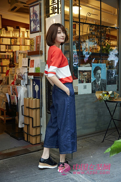 相同的一条牛仔阔腿裤上衣搭配不同,效果就不同,普普风女装牛仔阔腿裤搭配一件条纹T恤,红色和白色拼接的颜色,虽然款式是比较的简单,但是阔腿裤就是不需要这么多的花头精来点缀,简单就很时尚了,姑娘们可以来试试看哦。