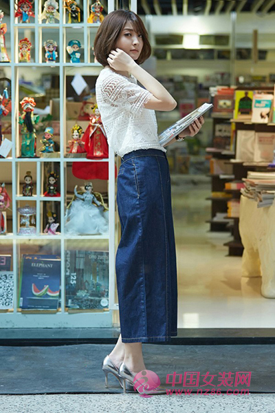 牛仔阔腿裤九分裤的设计,宽松的裤腿上身和下身的线条可以完美的比例呈现,高腰的阔腿裤款式搭配一件蕾丝衫,蕾丝上衣显得比较的清透,如果是透视的蕾丝你可以配上抹胸,不要配上背心这样显得没有档次。