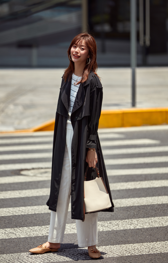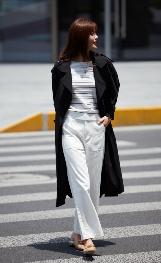 日本进口面料黑色长风衣*条纹毛衫*白色大口袋棉布裤