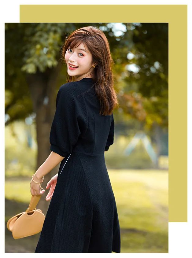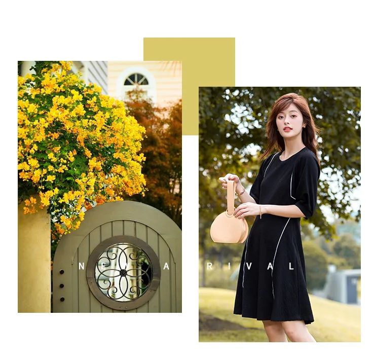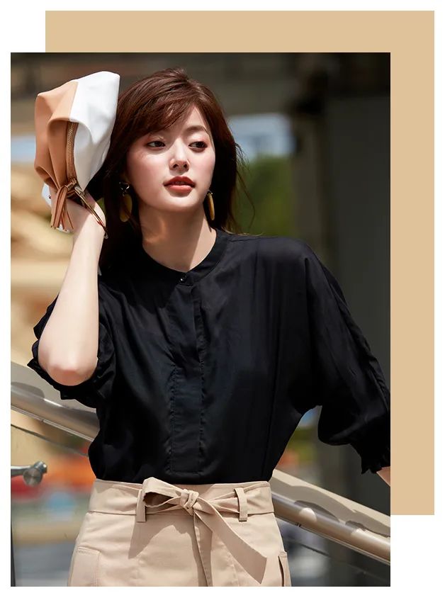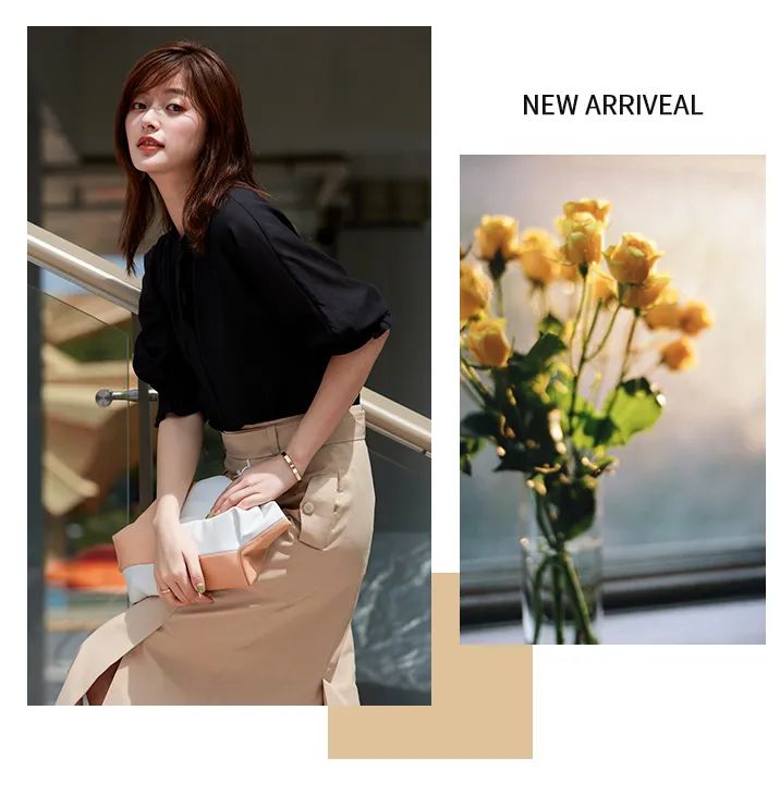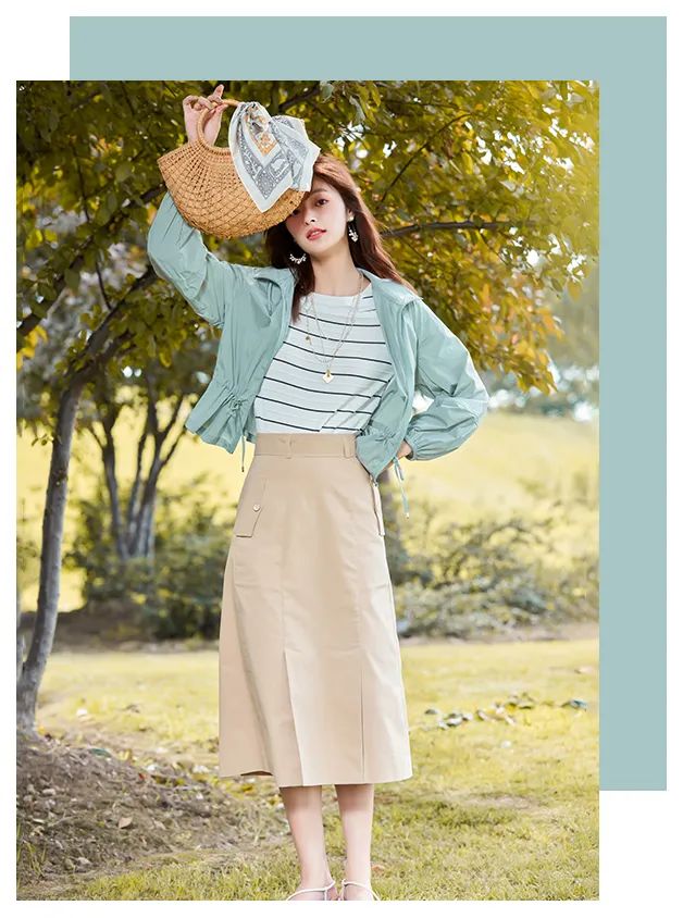 内衬条纹针织上衣,下搭简洁卡其色半裙