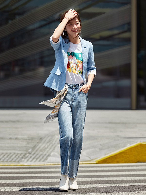 这款穿搭将商务感和休闲感结合在一起,不过其中休闲感还是最重的,小西装外套俏皮可爱,搭配白白色趣味图案短袖,看起来很是活泼,下身选择一款牛仔裤,高腰的搭配轻松勾勒出自己的高腰线,让自己看起来更加的高挑迷人,一双短靴的搭配很是优雅。