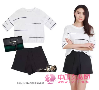 像半身裙一样简练的短裤款式,比起穿半身裙没有负担感,又有半身裙的女人味产品。搭配不规则的条纹小衫,简单易穿,又具备鲜明的个性。