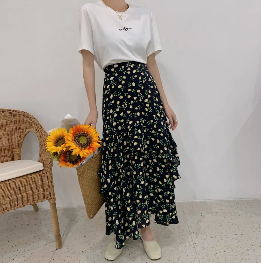 活力黄色的印花让人瞬间感受到曾错过的那些春色,搭配简单的白T恤,做个清爽的鲜花系女孩也不错呀,彰显清爽个性的穿衣态度,而且超适合梨型身材的人。