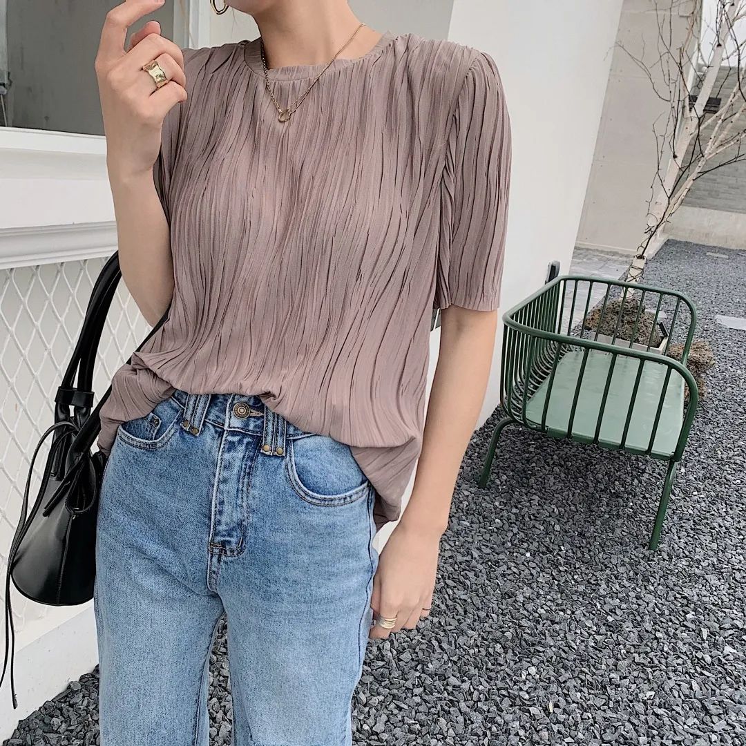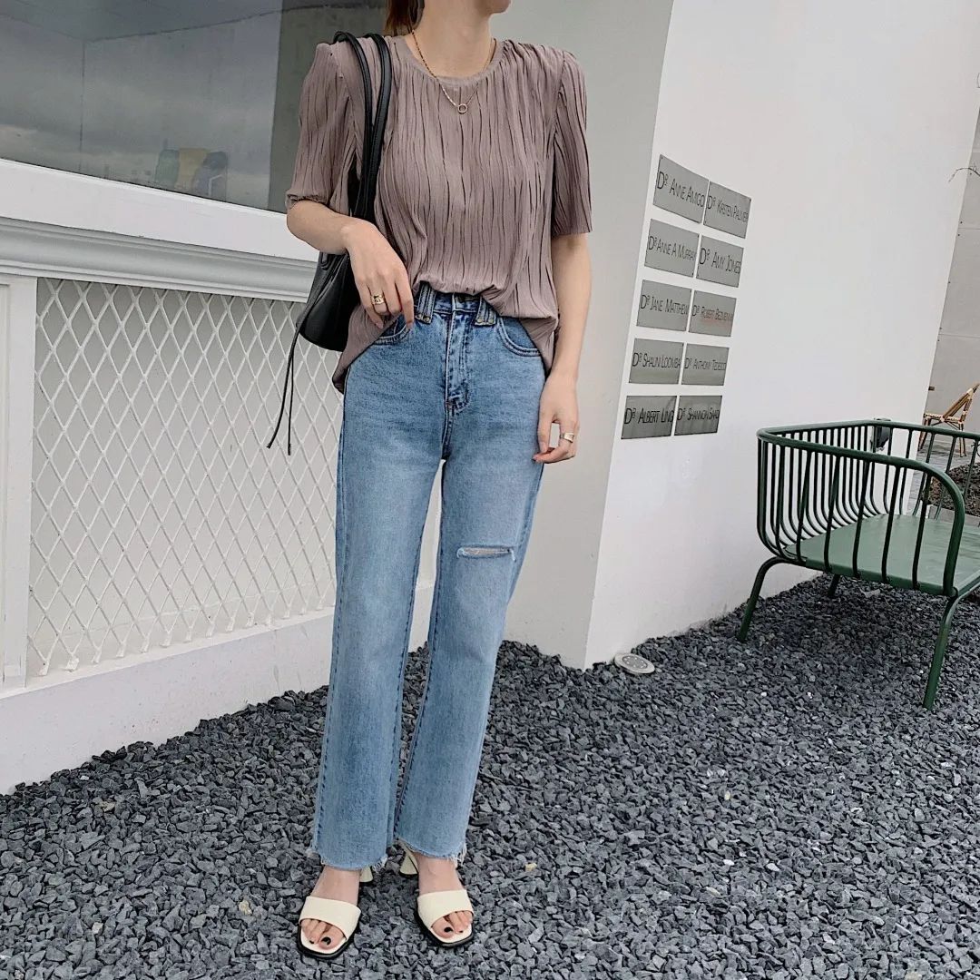 回归工作的都市气质风穿搭,是温柔有力量的诠释。灰调藕粉色的压褶上衣,即使搭配平平无奇的牛仔裤,也能穿出独立中有着些许柔和的风格。