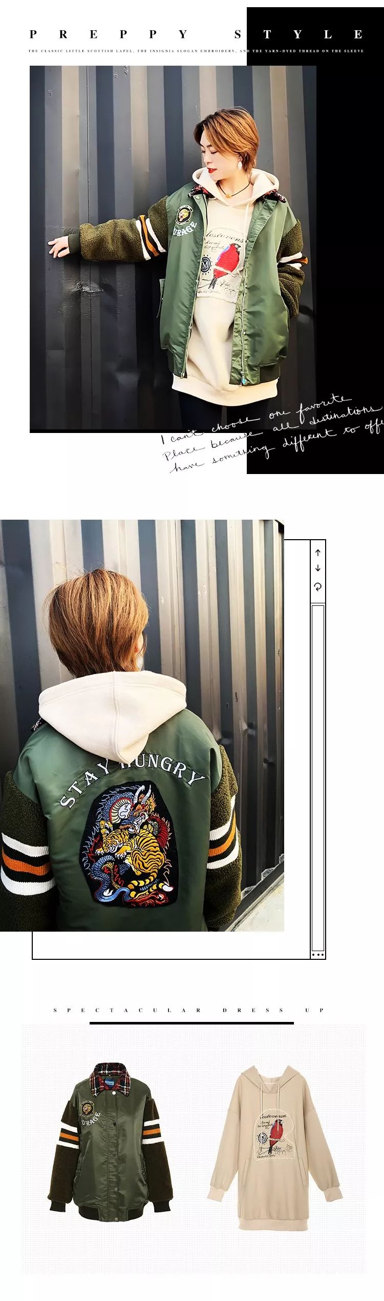 爆款棒球服和连帽卫衣,你还没GET?干净利落的同时秀出大胆个性,学院风棒球服外套有100个喜爱的理由。经典苏格兰小翻领,徽章slogan刺绣,还有袖子上拼接的色织螺纹。颜色是本季超好搭配的学院绿,版型也是考究,有了这件可以轻松get搞定英伦风。